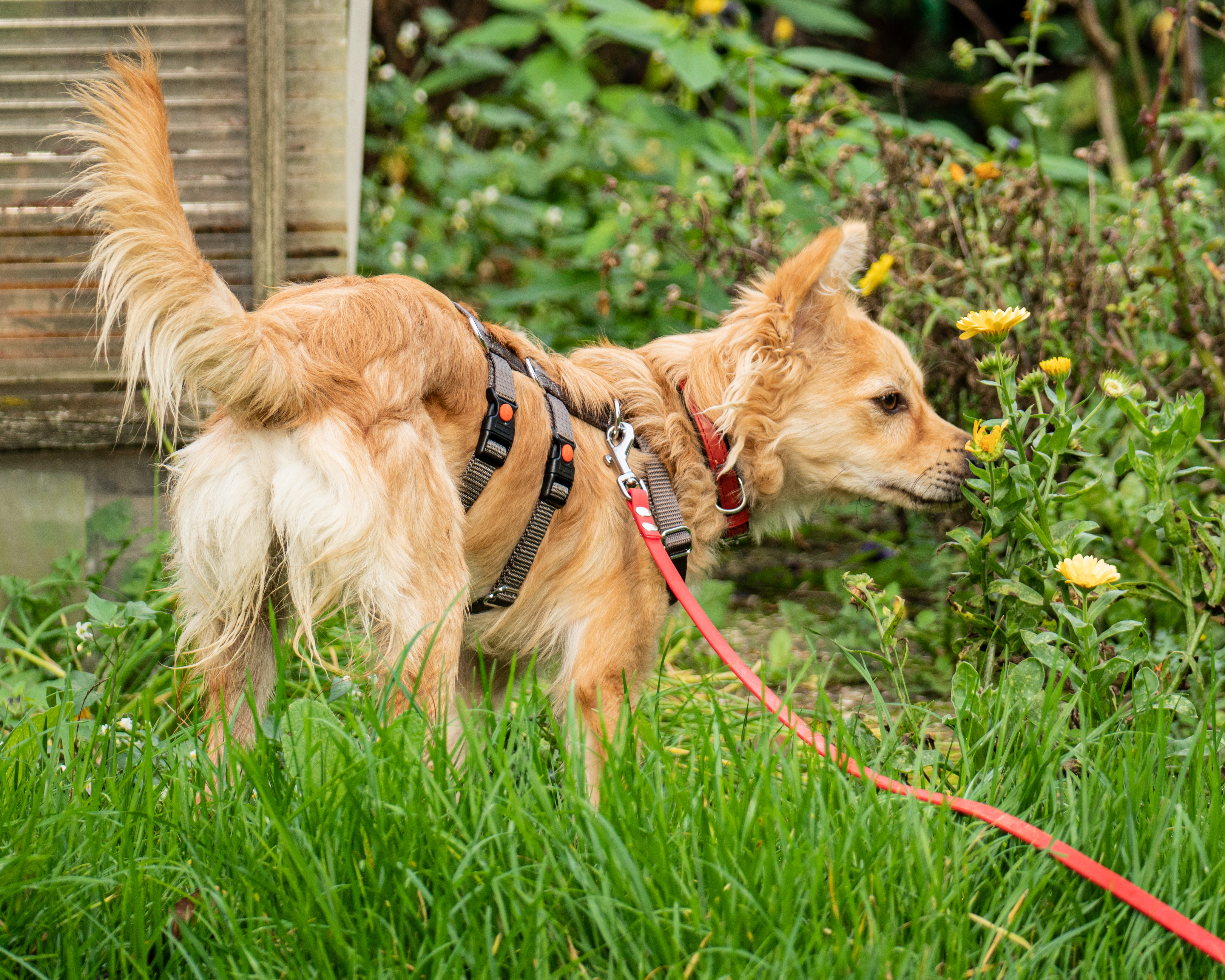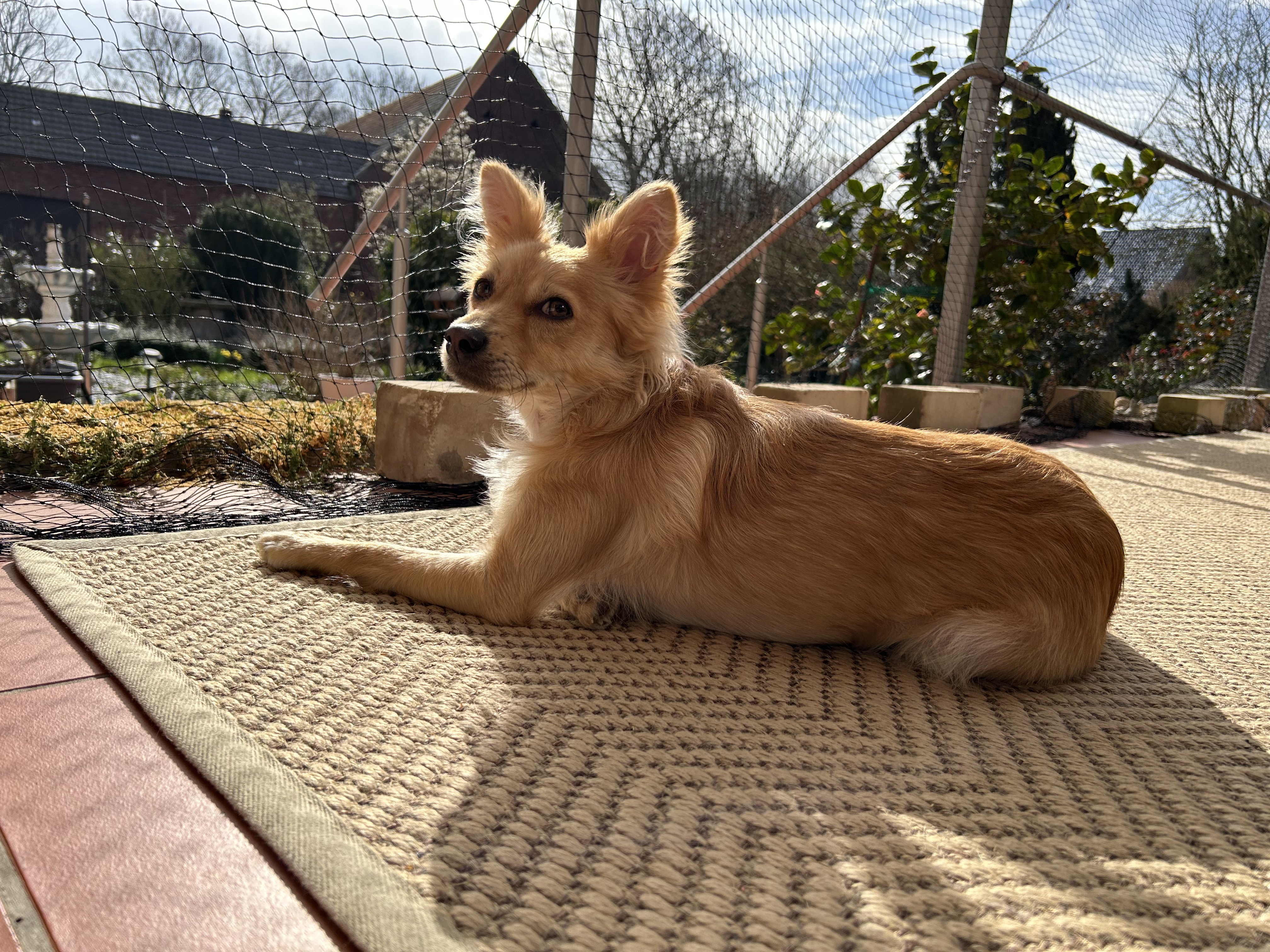 Anfangs war unser Garten noch nicht vollständig eingezäunt, weshalb er nur an der Leine nach draußen durfte. Das störte ihn aber nicht im Geringsten. Mit seiner Schleppleine rannte er begeistert im Kreis durch den Garten – pure Lebensfreude! Um ihm mehr Bewegungsfreiheit zu ermöglichen, installierten wir provisorische Zäune und Netze. So konnte er uns fortan ohne Leine im Garten begleiten.